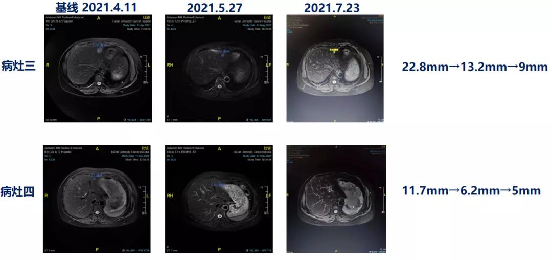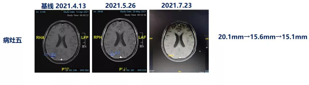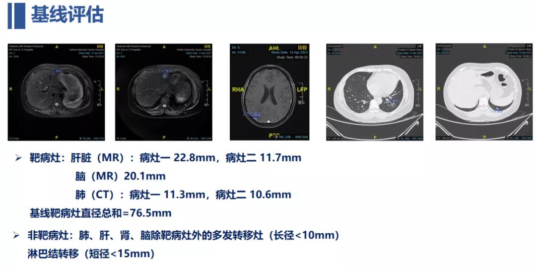 靶病灶:肝脏(MR)9mm+5mm,脑(MR)15.1mm,肺(CT)6.8mm+6.8mm;靶病灶直径总和=42.7mm,达PR。