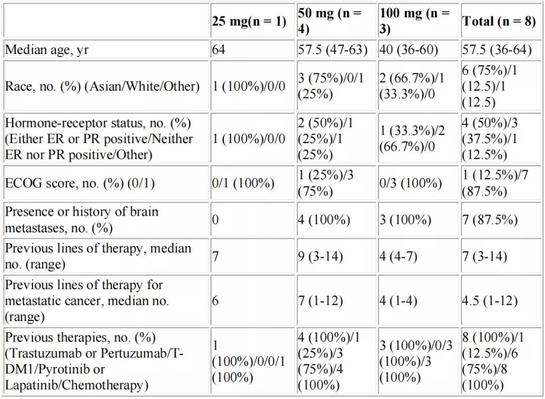 截至2021年6月15日,有8名美国和中国HER2+MBC患者口服DZD1516 25毫克、50毫克和100毫克,每天两次。表1总结了患者人口统计数据。所有患者均接受过抗HER2抗体和化疗治疗。大多数患者(75%)也曾接受过抗HER2小分子治疗。DZD1516在试验剂量下耐受性良好,未观察到剂量限制毒性。表2中总结了安全数据。DZD1516的药物暴露量呈剂量比例增加,单次和重复给药的半衰期分别为大约为14.5-19.5小时和1.68~2.46倍累积。在BM患者中,DZD1516及其活性代谢物DZ2678的Kpuu,CSF分别约为1.82和0.78。患者入组正在进行中。最新数据将在会议上公布。