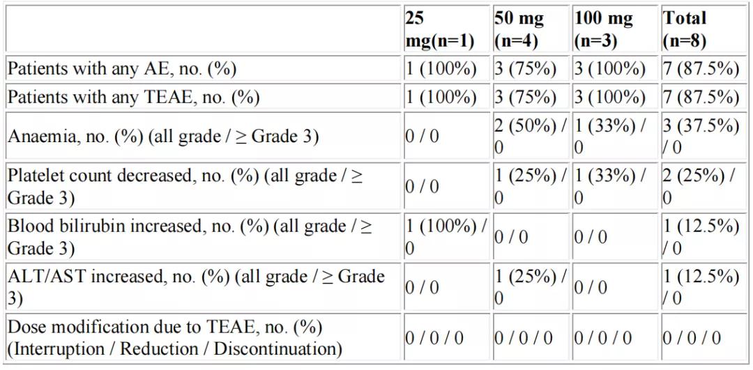 在剂量爬坡试验中,我们采用了25毫克、50毫克、100毫克bid的爬坡方式,我们发现重复给药后的暴露剂量是单剂给药的2.46倍左右,患者的整体安全性是可控的。虽然整体上约有87.5%的患者发生治疗相关AE,但大多数可控。对于头痛等常见的毒副反应,在经过一段时间以后也会得到缓解。