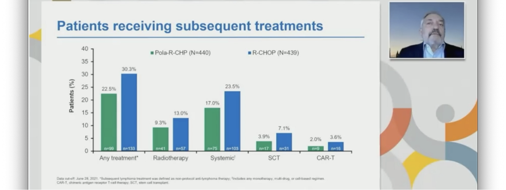 结果令我们兴奋的是POLARIX试验得到了阳性的结果。该项研究表明,pola-R-CHP方案较R-CHOP标准方案,PFS率得到了提高。不过,我们仔细解读这篇文章就能发现新方案在完全缓解率上的差别并不明显,甚至在目前的总体生存方面没有显著差异。不过,新方案延长了维持缓解的有效时间,从而也减少了这一部分患者今后需要治疗的可能性。我们在长期的观察当中发现,有些患者可能需要其他的治疗,包括维持治疗、放疗或其它药物治疗。而新方案可以减少需要治疗的风险或者疾病进展的风险。
