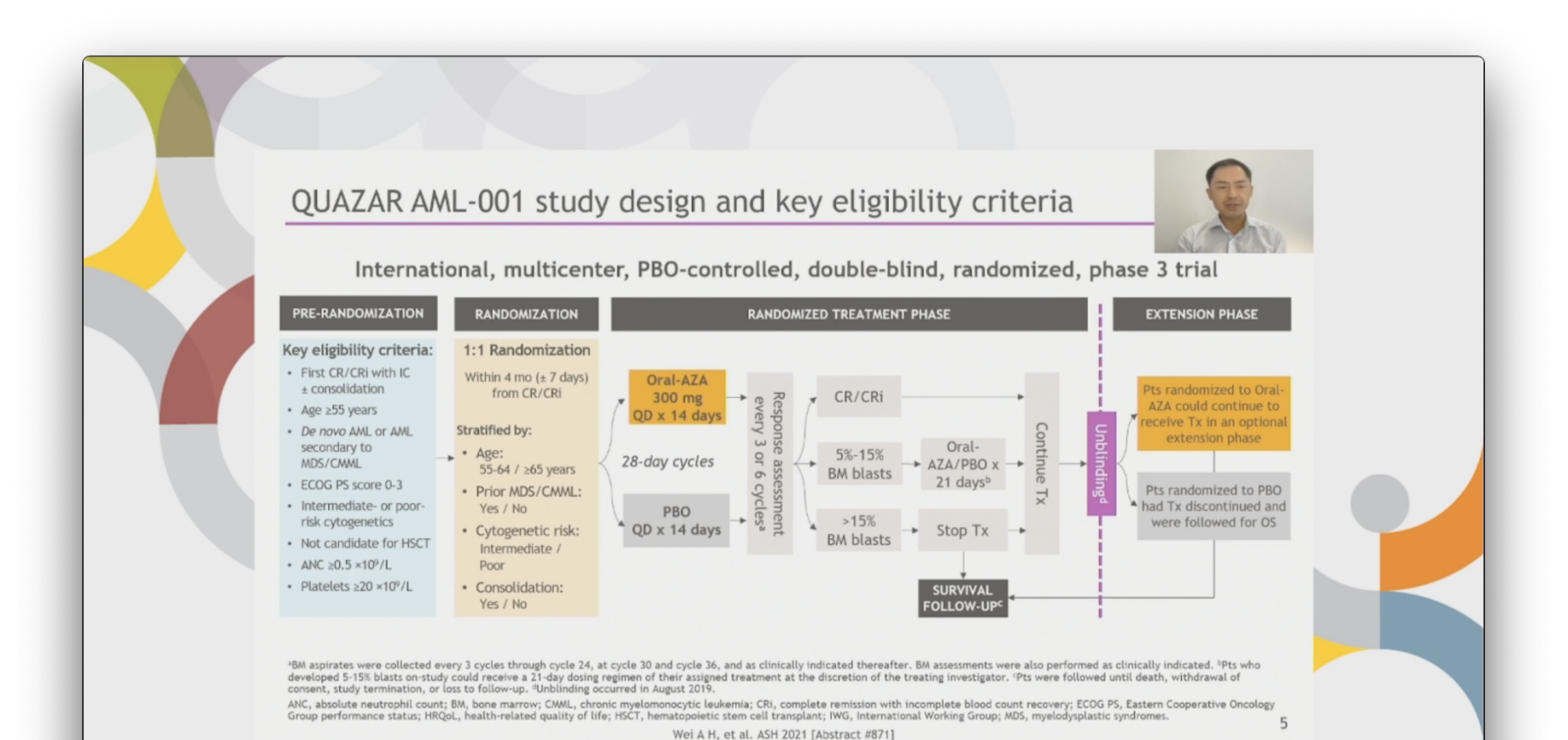 本届ASH年会上,该项研究报告了后续更新的数据(大会摘要号:871)。研究从2019年7月截至2020年9月份,观察了14个月的时间,入组的患者都是≥55岁新诊断、中高危的AML患者,通过诱导治疗以及巩固治疗,能够达到CR/CRi,经过四个月的持续CR/CRi,对患者进行了1:1的随机分组,治疗组是口服阿扎胞苷(300mg),安慰剂组作为对照。治疗时间每个周期是14-28天。