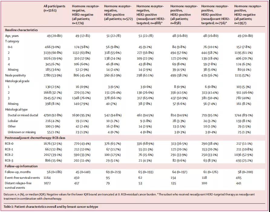 在这项汇总分析中,通过与现场调查人员的沟通,确定了欧洲和美国12个研究所和相关临床试验(4项随机对照试验、8项队列研究),其中包括1994年9月12日至2019年2月11日接受新辅助化疗的5161名患者的数据。2019年11月,我们从接受新辅助化疗和手术治疗的原发性Ⅰ~ Ⅲ期乳腺癌患者(18岁)中获得了参与者的RCB结果、临床和病理分期、肿瘤亚型和分级、治疗和随访数据。研究者使用混合效应Cox模型,结合随机RCB和队列效应,评估了连续RCB评分与主要研究结局(无事件生存率)之间的相关性,以解释研究之间的异质性,并分层以解释激素受体状态和HER2状态定义的不同癌症亚型的基线风险差异。