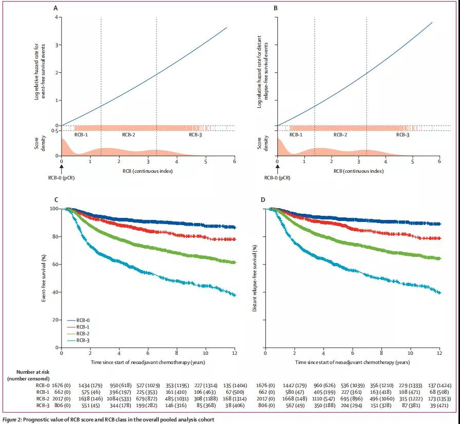 20世纪70年代后期,新辅助化疗诞生,用于局部晚期不能手术的乳腺癌患者的治疗。与辅助治疗相比,术前新辅助治疗可以缩小肿瘤体积并降低患者肿瘤分期,从而允许患者进行更多的乳房和腋窝手术,这也为患者的治疗提供了重要的预后信息。残留癌症负荷(RCB)评分于2007年首次提出,旨在通过提供一套标准方法来评估和量化新辅助化疗后乳腺和腋下淋巴结残留疾病的程度,从而解决这些缺陷产生一个连续的分数。但RCB的预后价值尚未在大型研究中被证实,且各分子亚型中RCB的预后价值是否存在差异也有待证实。日前, Lancet Oncol发表了一项5161名患者的数据分析,证实了新辅助化疗RCB评分可预测所有亚型患者的长期预后。