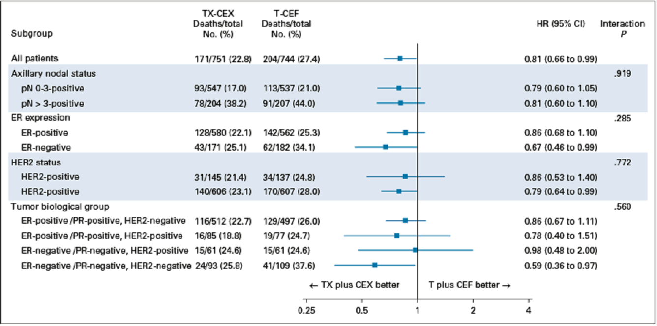 然而,近日JCO杂志发表该研究随访15年的总生存结果却发生“大反转”。TX-CEX组的15年OS率较T-CEF组有显著提高(77.6% vs 73.3%,HR 0.81,95%CI:0.66~0.99,P=0.037)。亚组分析显示,ER阴性、TNBC亚组患者OS获益更显著。