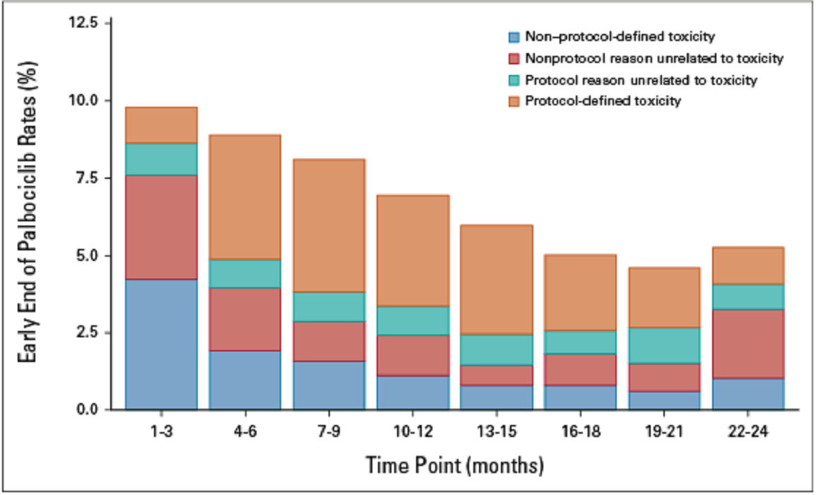 2022年1月7日,JCO杂志发表的一篇文章,评估了PALLAS研究中哌柏西利的暴露和停药情况。在CDK4/6i+ET组2840例患者中,有1199例(42.2%)提前停用哌柏西利,其中772例(27.2%)由于不良反应而停药,且中性粒细胞减少和疲劳的发生率最高。两组患者的内分泌治疗停药比例相似。如下图所示,治疗前3个月的停药主要由于与毒性无关的非治疗方案原因(红)以及非治疗方案毒性(蓝),随后以治疗方案毒性(黄)为主,治疗22~24个月时则以非治疗方案非毒性原因为主(红)。