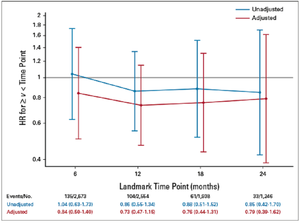 此前分别发表于JCO和JAMA Oncol的随访6年和随访10年的数据均为阴性结果,两组间的RFS(6年和10年的HR分别为0.79和0.88,P分别为0.087和0.23)和OS(6年和10年的HR分别为0.73和0.84,P分别为0.080和0.15)均无显著差异。