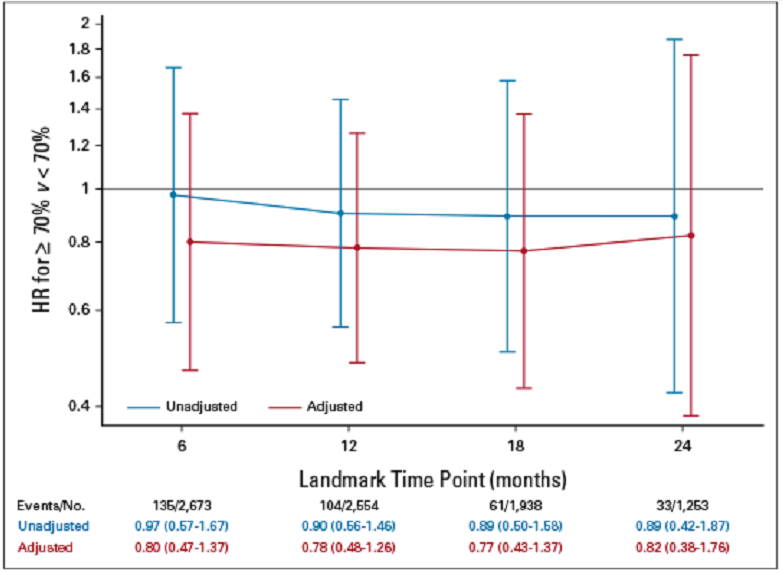 哌柏西利疗程较长或剂量强度≥70%,与患者iDFS改善无显著相关性。在符合方案分析(PP)加权中,患者接受或未接受CDK4/6i治疗的iDFS无显著改善(HR 0.89,95%CI:0.72~1.11)。