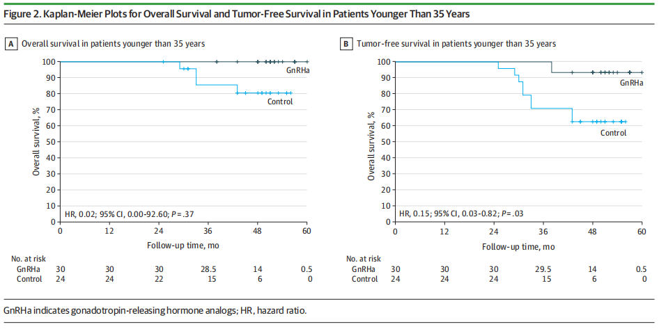 中位随访49个月,两组之间4年OS率和TFS率的差异不显著。但事后分析显示,在年龄小于35岁的患者中,GnRHa组的TFS率高于对照组(93% vs 62%;P=0.004;HR 0.15;95%CI:0.03~0.82;P=0.03)。