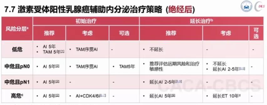 金锋教授:对于绝经后HR阳性乳腺癌患者的内分泌治疗,5年AI初始治疗仍是标准,仅在部分低危患者中推荐5年TAM或考虑TAM序贯AI治疗。对于高危,尤其是淋巴结阳性患者,推荐初始5年治疗后延长AI治疗,中危且pN1患者则(根据耐受性情况)推荐2-5年AI的延长治疗,中危pN0患者可根据远期复发风险和治疗敏感性评估综合评估决定是否延长内分泌治疗。此外,由于国内适应症的获批问题,CDK4/6i辅助强化治疗作为高危患者“考虑”等级推荐。