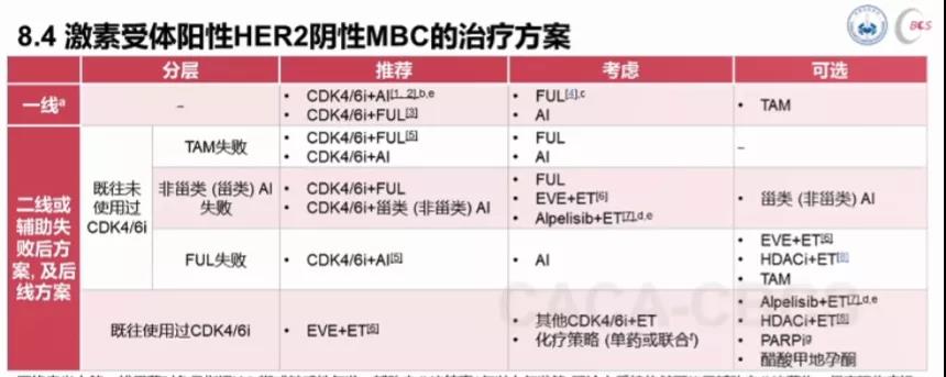 解救内分泌治疗:CDK4/6i+AI或者CDK4/6i+氟维司群是推荐的优选一线内分泌治疗方案,单药氟维司群、AI作为“考虑”方案,单药TAM作为“可选”方案;解救化疗后进行内分泌维持治疗是合理的选择,尽管目前没有RCT数据支持。