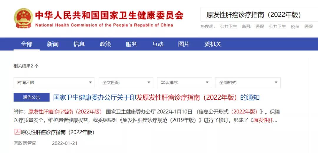 2022年1月21日,国家卫生健康委官网发布了“国家卫生健康委办公厅关于印发原发性肝癌诊疗指南(2022年版)的通知”。