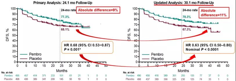 本次ASCO-GU年会公布了帕博利珠单抗用于高危肾癌术后辅助免疫治疗的3期随机对照临床研究(Keynote564研究)的30个月随访数据更新,结果显示帕博利珠单抗组和安慰剂组24月DFS率分别为78.3%和67.3%,帕博利珠单抗治疗的DFS获益显著性进一步扩大,24个月的DFS率两组绝对数据差值提高至11%,其中对于中高危、高危以及转移灶术后无瘤的亚组分析均能从免疫辅助治疗中获益,特别是转移灶术后无瘤的亚组。而对于合并肉瘤样分化的人群,24个月的DFS率两组绝对数据差值提高至20%。进一步的安全性随访显示两组治疗相关的3-5级不良反应没有增加,分别是18.9%和1.2%,均未发生治疗导致的死亡。