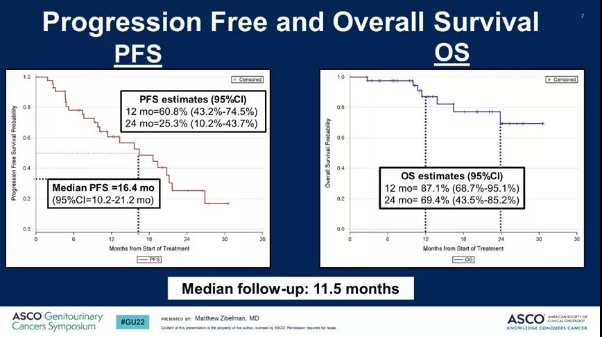 我们中心在本次ASCO-GU会议上报告了58例集合管癌患者的临床特征,这是目前最大宗晚期集合管癌的病例队列,其中男性占60%,22%的患者超过65岁。39.7%的患者初诊即为IV期。在无远处转移的35例患者中,淋巴结阳性者为51%,T3-4者占63%,G3/4占51%。DFS为6.3月(95%CI:0.2-12.4),中位OS为22.5月(95%CI:16.6-28.4)。在最终出现转移的56例患者中,常见的转移部位包括:淋巴结(55%),肺(46%),骨(36%),肝(16%),肾上腺(7%),和局部复发(20%)。转移后中位OS为11.3月(95%CI:9.5-13.0),其中33人接受一线吉西他滨/顺铂/索拉菲尼治疗,ORR为24.2%,DCR为75.8%,中位PFS为6.1月(95%CI:4.7-7.5),中位OS为12.1月(95%CI:8.6-15.5)。2例患者接受阿昔替尼+抗PD-1单抗治疗,1例获得PR,另一例为缩小的SD,目前仍在接受治疗中。