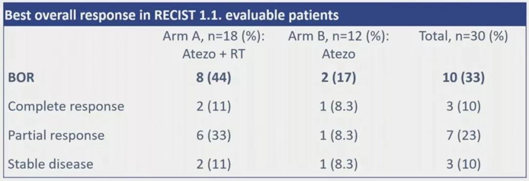 该研究入组了32例经组织学证实的有远处转移或LRAPC的aPeCa患者,WHO状态为0-1,除免疫治疗外允许任何既往治疗。主要分为两个治疗队列,A、B队列均接受1200mg阿替利珠单抗q3W(最多1年),A队列则同时接受区域放疗(33 X 1.5-1.8 Gy),每12周通过CT扫描进行疗效评估(RECIST 1.1),使用NCI-CTCAE V4进行毒性评估。主要终点为1年PFS率≥35%。