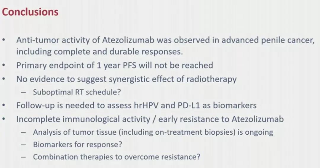 研究人员认为,尽管该研究未达到主要终点,但在aPeCa患者中观察到了阿替利珠单抗的抗肿瘤活性,包括完全和持久的缓解。Hielke Martijn de Vries教授在报告中提出了一些问题:研究中并没有观察到放疗与免疫治疗的疗效增加,是否还有其他次优的放疗方案?研究中观察到部分患者对免疫治疗完全无反应或者发生早期耐药,需要进一步收集肿瘤组织进行标志物分析,包括hrHPV、PD-L1等标志物的评估和随访;他同时表示联合系统治疗或许可以克服耐药。