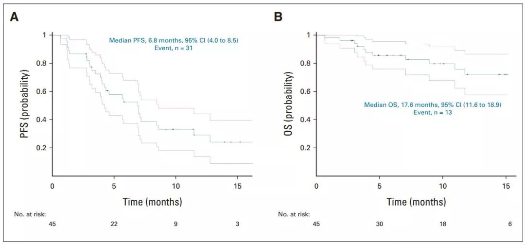 全组患者中位PFS为6.8个月,1年PFS率29%,中位DOR为11个月。数据分析时,33%的患者仍然持续接受治疗,全组患者的中位OS为17.6个月。基线有脑转移和无脑转移的患者,ORR分别为14.3%和35.5%。
