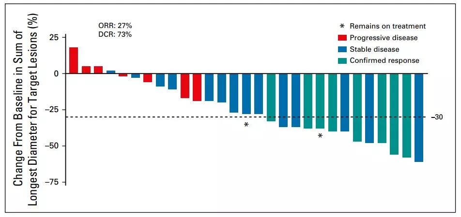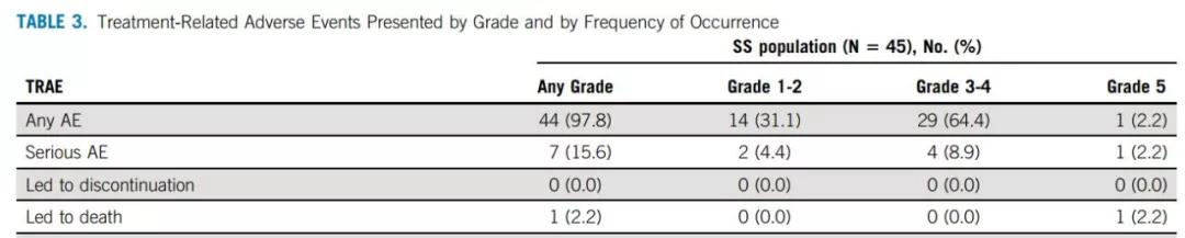 安全性:全组3度及以上不良反应发生率为64%,无患者因不良反应而导致治疗中止,1例患者在家中出现猝死,但与治疗的相关性不明。较常见的3度及以上治疗相关不良反应包括:中性粒细胞下降33%、腹泻13%、贫血9%。没有间质性肺炎的患者出现。