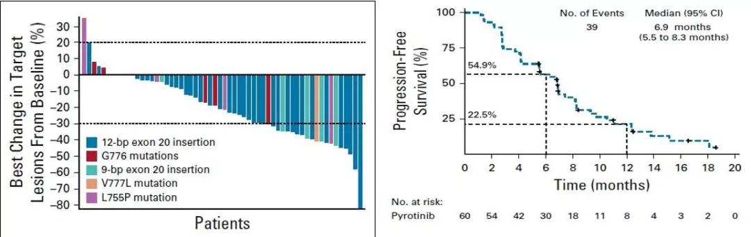 ■ 吡咯替尼:吡咯替尼是一款针对HER1/2及HER4的小分子酪氨酸激酶抑制剂,其治疗HER-2突变的晚期NSCLC患者疗效及安全性的数据发表于JCO杂志。在这项开放标签、多中心、单臂II期临床研究中,研究者共纳入60例患者,41.7%的患者既往接受过至少2种治疗方案,没有患者接受过免疫治疗。突变类型而言,插入突变占多数,包括:20外显子12个碱基对插入突变(71.3%),G776突变(12%),20外显子9个碱基对插入突变(8.3%),V777L突变(1.7%),L755P突变(6.7%)。独立评审委员会评估的ORR为30%,DCR为85%,中位反应持续时间为6.9个月,中位PFS为6.9个月,12个月PFS率为22.5%,50%的患者出现死亡事件的情况下,患者中位OS为14.4个月,12个月OS率为69.1%。44例携带20外显子12个碱基对插入突变患者的ORR为27.3%,6例携带G776突变的患者ORR为16.7%,5例携带20外显子9个碱基对插入突变患者ORR为60%,1例携带V777L突变的患者为PR,4例携带L755P突变的患者ORR为25%。共有12例患者基线出现脑转移,有脑转移和无脑转移的患者,独立评审委员会评估的ORR分别为25%和31.3%,中位PFS分别为5.5个月和6.9个月。就安全性而言,3度和4度不良反应发生率分别为26.7%和1.7%,1.7%的患者因治疗相关不良反应导致治疗中止,21.7%的患者出现治疗中断,3.3%出现严重不良反应。随后,在2021年的ASCO年会上,摘要号为9035的研究还公布了吡咯替尼联合阿帕替尼治疗HER2突变的患者的疗效,但单纯从数值上看,疗效提高似乎并不明显。这项研究共纳入33例患者,仍然以插入突变为主要突变类型,全组患者的ORR和DCR分别为45.5%和93.9%,中位PFS和OS分别为6.8个月和12.9个月。