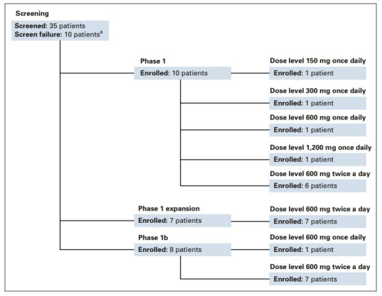 23例患者中,92%的患者出现任何级别治疗相关不良反应,3度及以上不良反应发生率为36%,包括恶心76%、腹泻72%、呕吐48%和乏力40%。在接受600 mg,每日两次的推荐治疗剂量的20例患者中,最常见的任何级别治疗相关不良反应为恶心80%、腹泻70%、呕吐50%、乏力45%,最常见的三度及以上不良反应发生率为疲乏15%。65%的患者因治疗相关不良反应需要治疗中断或剂量减低,20例接受推荐剂量的患者中,有16例非小细胞肺癌和2例结直肠癌。16例非小细胞肺癌患者中,15例可进行疗效评估,经过中位19.6个月随访后,患者的ORR为53.3%,中位DOR为16.4个月。接受后续推荐给药剂量的16例患者,中位PFS为11.1个月,6个月和12个月的PFS率分别为64.3和50%,中位OS未达到,6个月和12个月的OS率分别为73.3%和66.7%。