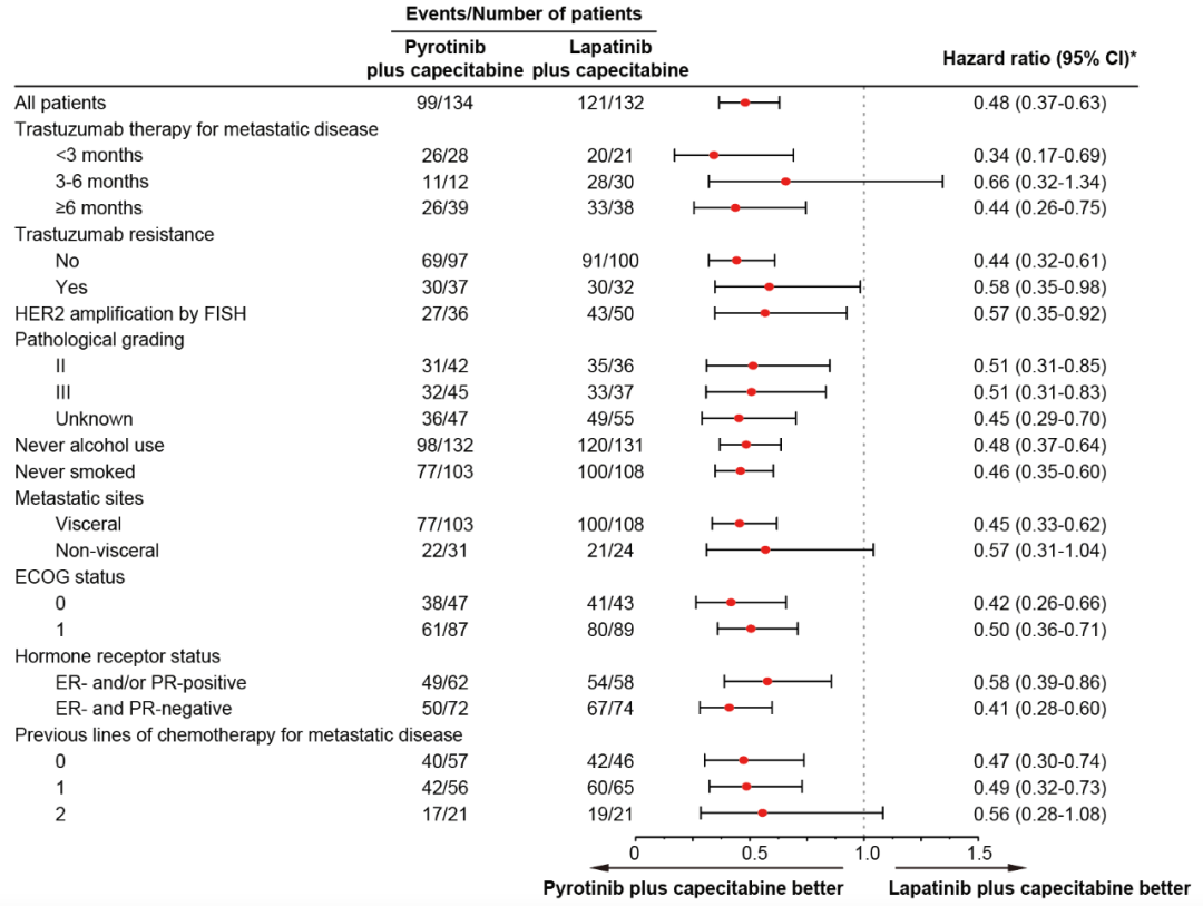 在PHOEBE研究入组的267例患者中,包含69例曲妥原发耐药的患者,试验组30例,对照组37例。根据进一步随访的主要终点PFS的亚组分析,无论曲妥是否耐药,都能观察到患者可以从吡咯替尼联合卡培他滨的治疗中获益的趋势。曲妥耐药人群,吡咯替尼组中位PFS为9.6个月,对比拉帕替尼组6.8个月,HR值为0.58(95% CI 0.35-0.98),PFS获益趋势明显,9.6个月无进展生存,单从数值上来看是目前在原发耐药这一群体中报道的最佳结果。