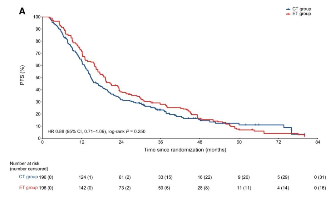 中位随访30.2(IQR 15.0~44.7)个月,内分泌治疗组和化疗组的中位PFS分别为19.2个月和14.8个月,达到非劣效性(HR 0.88,95%CI:0.71~1.09,非劣效P<0.0001)。内分泌治疗组和化疗组的中位OS分别为33.9个月和32.5个月(HR 0.82,95%CI:0.65~1.04,非劣效P=0.094)。