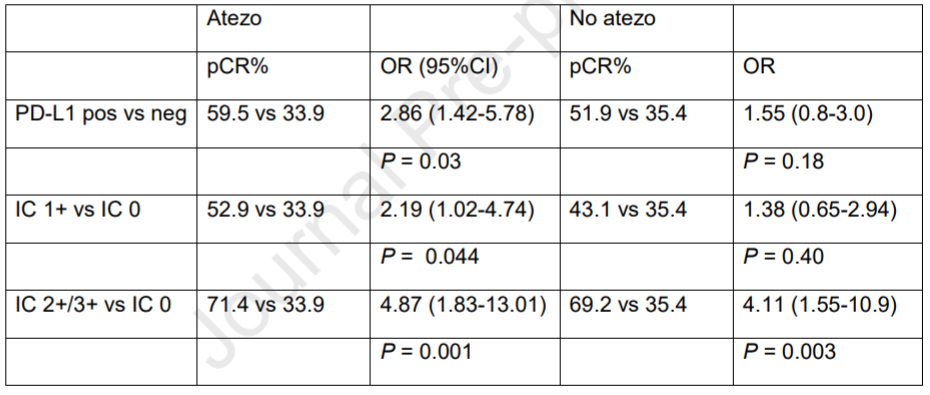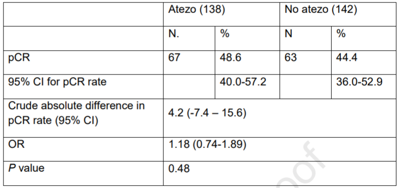 意向治疗分析显示,与未使用阿替利珠单抗相比,阿替利珠单抗治疗后的pCR率没有显著提高(48.6% vs 44.4%:OR 1.18;95%CI:0.74~1.89;P = 0.48)。