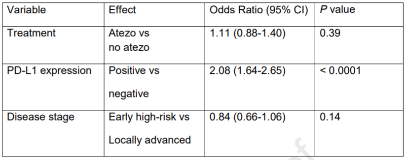 整体上,PD-L1表达水平越高,阿替利珠单抗治疗的pCR率更高,相较于IC 0患者的33.9%,IC 1+ 和IC 2+/3+的pCR率分别为52.9%和71.4%。