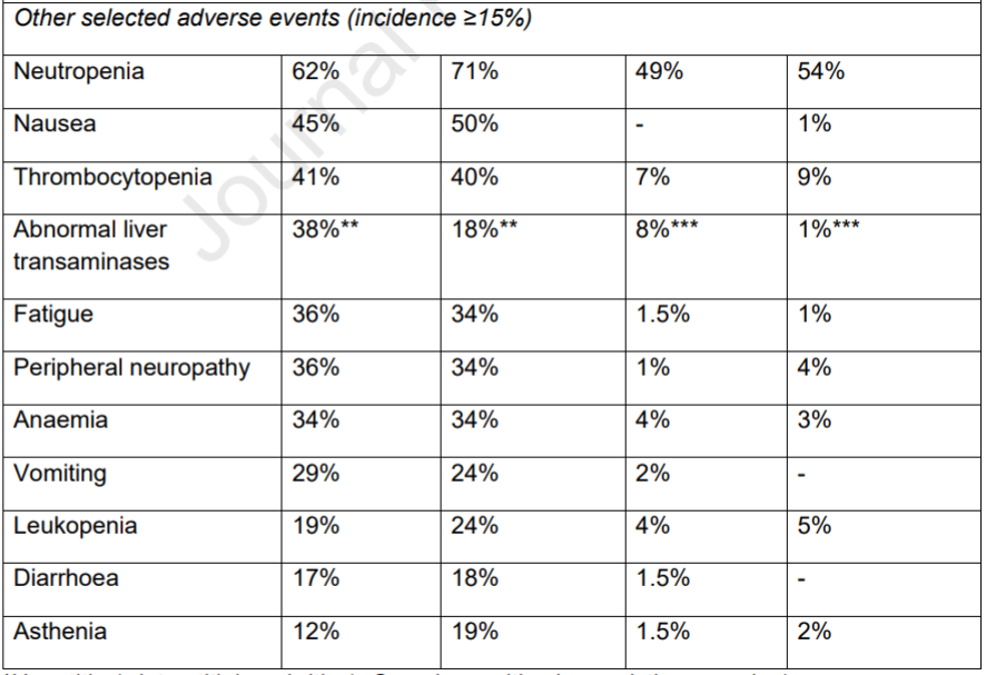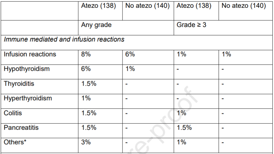 除了严重不良事件和肝转氨酶异常的总体发生率显著高于阿替利珠单抗外,两种方案的治疗相关不良事件相似。