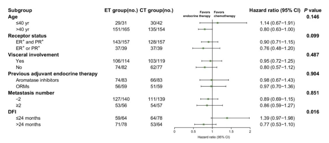 亚组分析显示,年龄>40岁、ER/PR同时阳性、ER/PR单阳、无内脏转移、转移部位<2或≥2、无病间期(DFI)>24个月的患者PFS HR更倾向于内分泌治疗;无内脏转移、既往AI或ORMs辅助治疗患者的PFS HR相当;而年龄<40岁、DFI≤24个月的患者PFS HR更倾向于化疗。