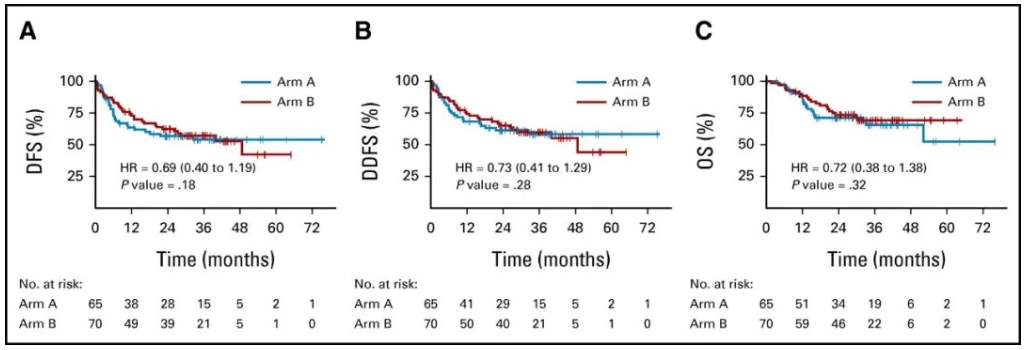 结果显示,A组与B组的2年DFS率分别为56.6%和62.4%,无显著差异(HR 0.69,95%CI:0.40~1.19,P=0.18)。两组患者远处无病生存(DDFS)风险(HR 0.73,95%CI:0.41~1.29,P=0.28)和OS风险(HR 0.72,95%CI:0.38~1.38,P=0.32)均相似。