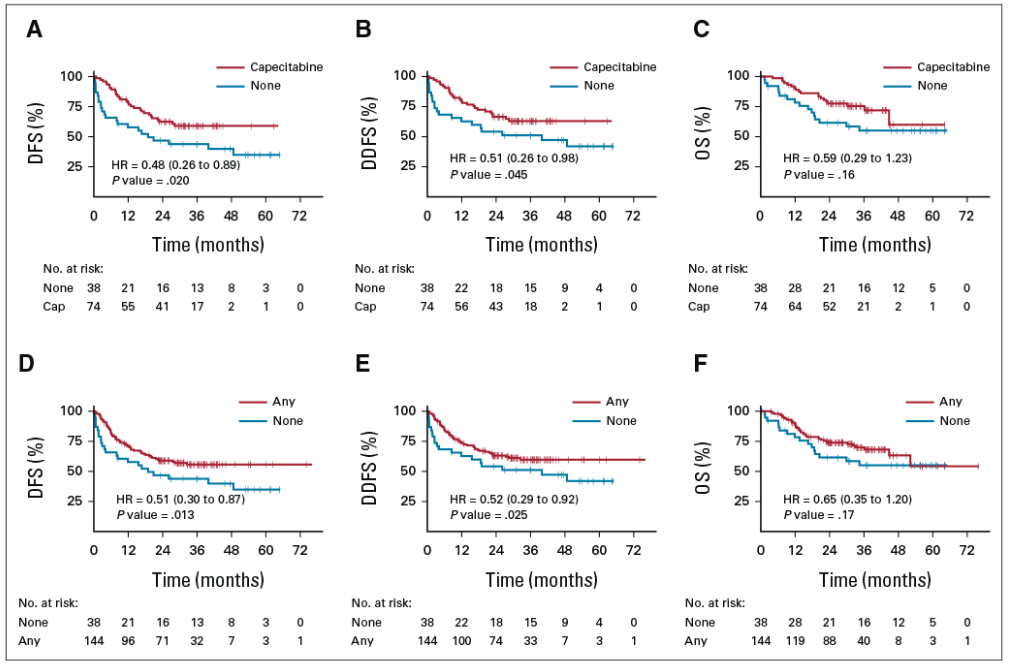 相较于没有治疗的患者,使用卡培他滨治疗患者的DFS也有显著改善(HR 0.48,95%CI:0.26~0.89,P=0.020)。