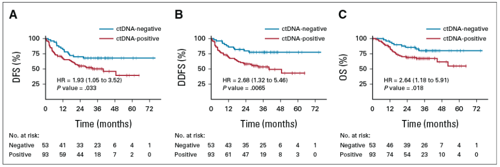 循环肿瘤DNA(ctDNA)可以作为治疗结局的重要预测因素,相较于基线ctDNA阳性患者,ctDNA阴性患者的DFS、DDFS和OS均有显著延长。