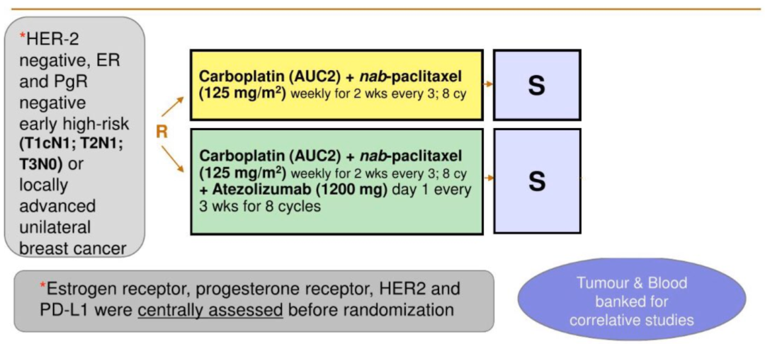 NeoTRIP研究入组了280例TNBC患者,随机分配至卡铂+白紫±阿替利珠单抗组,具体方案为第1天和第8天卡铂AUC 2+白紫 125 mg/m2,iv,第1天阿替利珠单抗1200 mg iv,术前每3周用药,共8个疗程;术后给予4疗程蒽环辅助治疗。主要终点为无事件生存期(EFS),关键次要终点是病理完全缓解率(pCR,定义为乳腺和淋巴结中无侵袭性细胞)