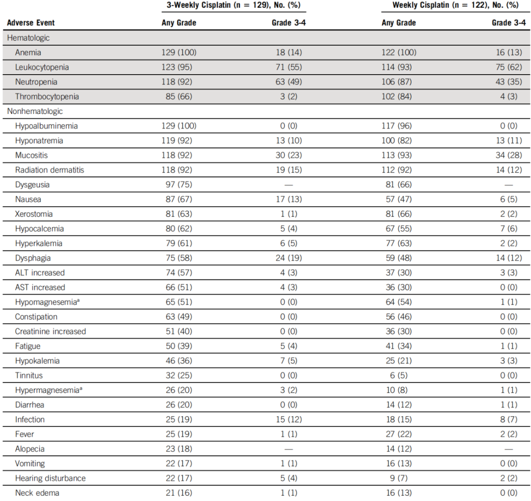 两组患者放疗和化疗按计划进行(表2)。安全性方面,15%的患者发生了急性血液学毒性相关不良事件(表3),而5%的患者发生了急性非血液学毒性不良事件,≥1%的患者发生了晚期毒性。特殊的AE包括中性粒细胞减少、感染、听力损害和肾损害,这些预期的不良反应在每周给药组中较少发生,这是每周给药的主要优点。