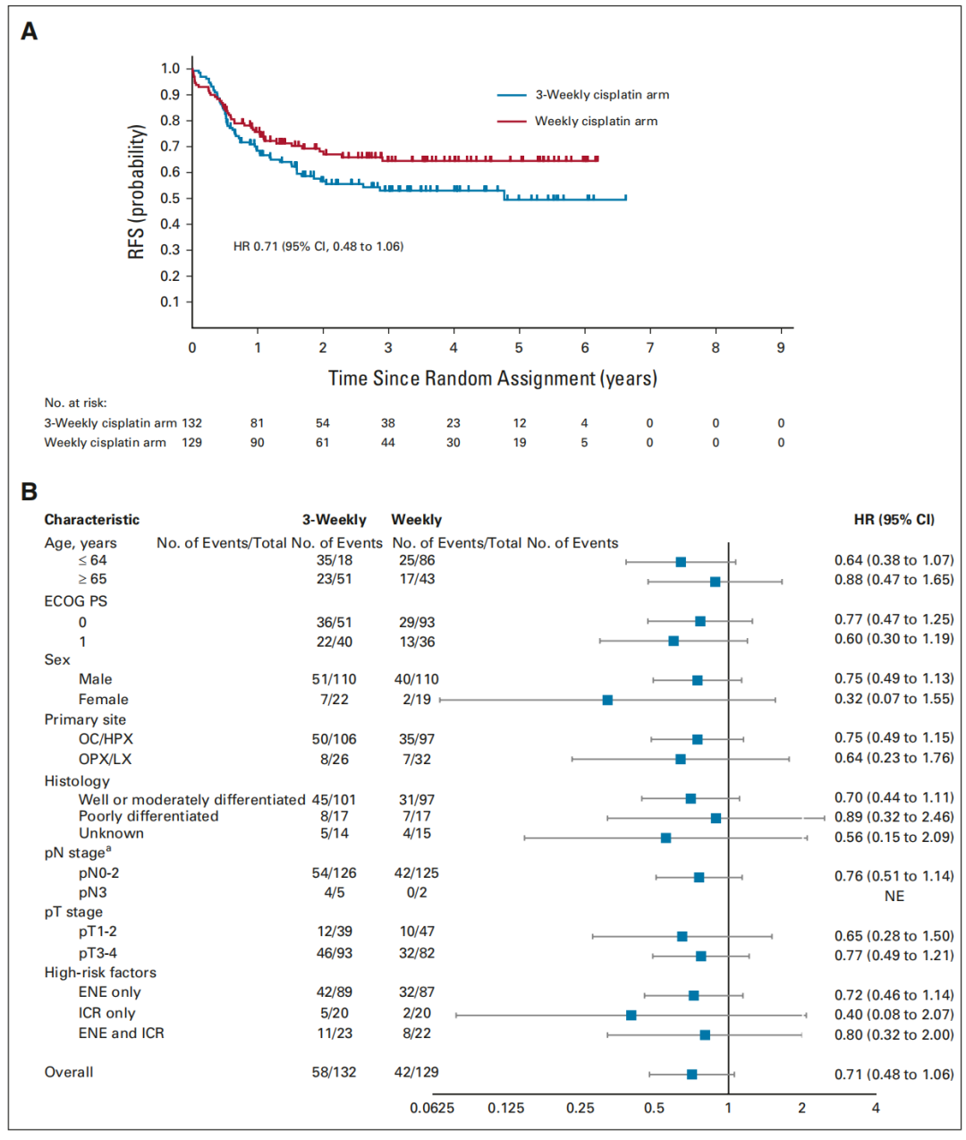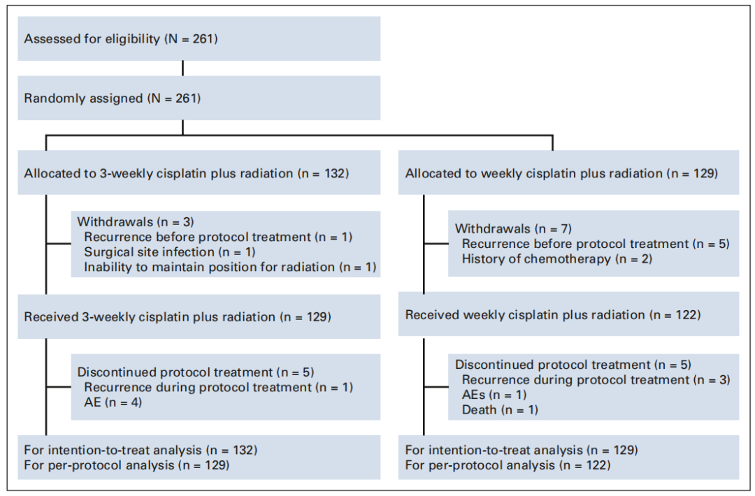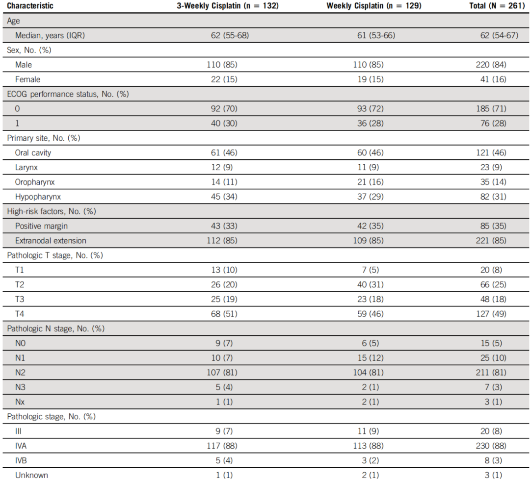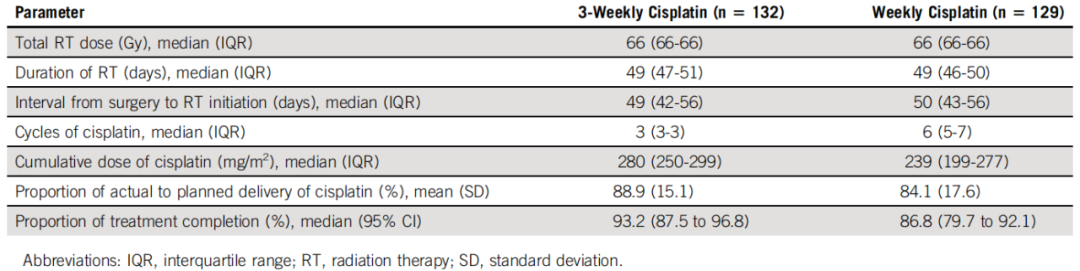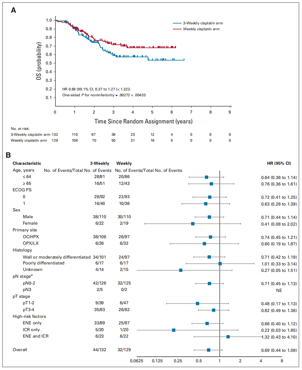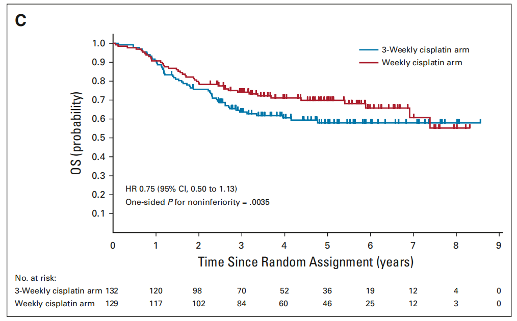 这项多中心开放标签的Ⅱ/Ⅲ期随机临床研究首次表明,在术后高危LA-SCCHN中,每周40 mg/m2的顺铂+放疗非劣效于每3周100 mg/m2的顺铂+放疗,相关不良反应也较少。
