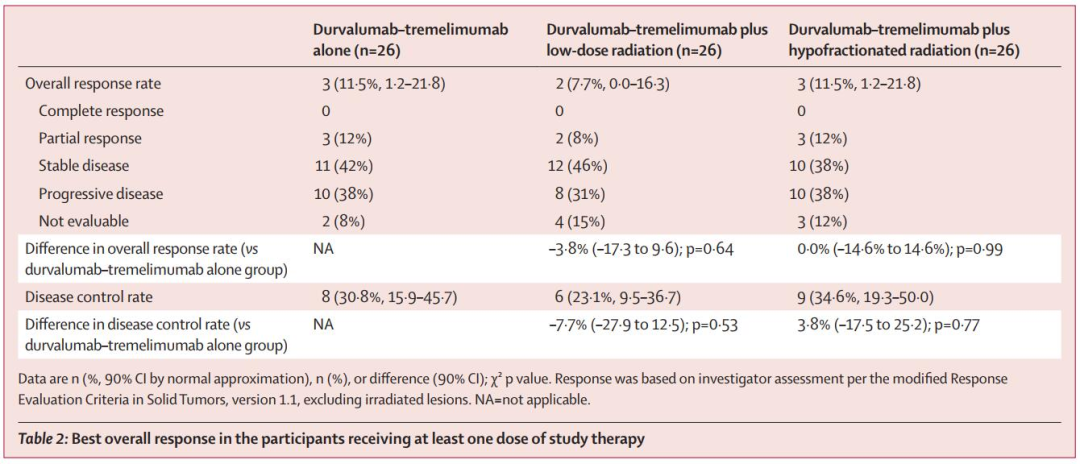 从2017年8月至2019年3月,共计90例患者完成筛查,78例患者入组,每组均有26例患者,三组患者基线特点均衡可比。在中期分析时,由于P值未达到预先设定的水准,因此研究被提前终止。全组患者中,32%的患者既往接受过非免疫治疗,最常见的放射治疗部位分别为:肺62%、淋巴结15%、肝脏12%、肾上腺10%。单纯免疫治疗组、低剂量放疗组及大分割组,ORR别为11.5%、7.7%和11.5%,差异无统计学意义。