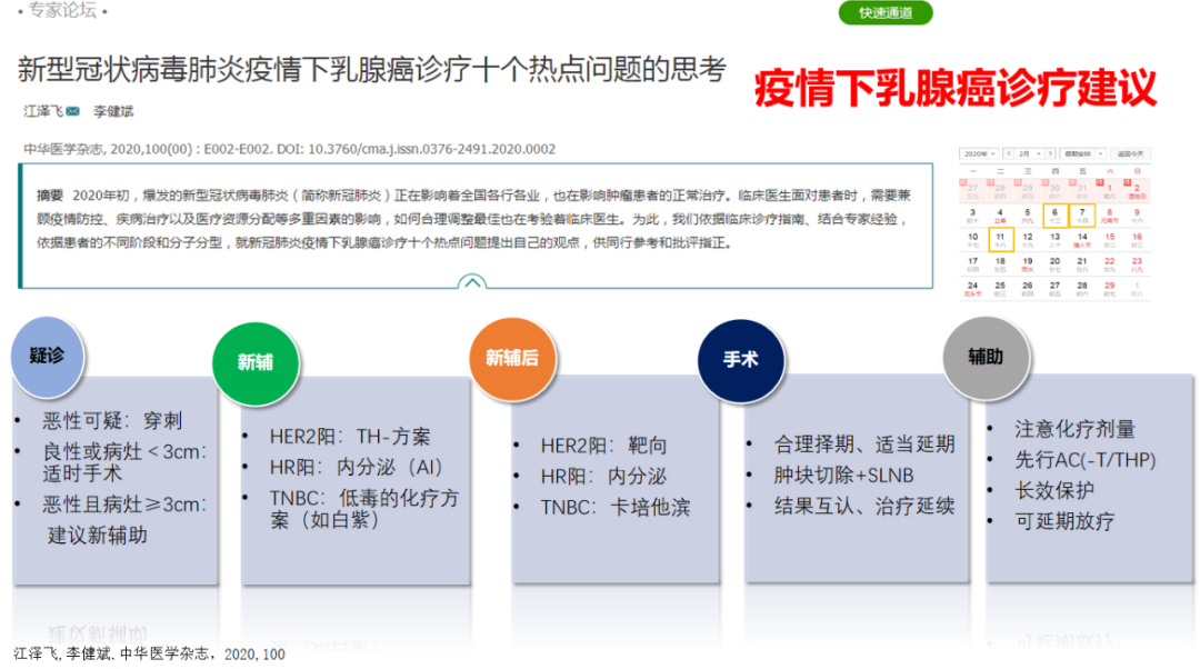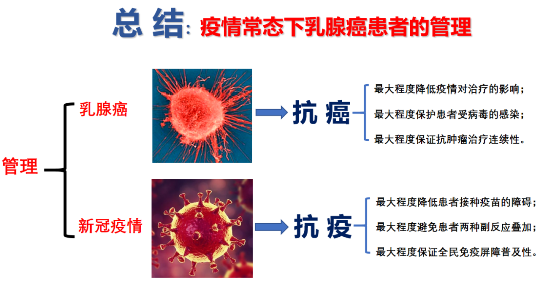 总之,我们要在“防疫”和“治癌”两方面采取相应的措施,确保乳腺癌患者得到延续、有效的抗癌治疗,同时确保患者的新冠感染风险降到最低、受到影响的程度降到最小。在疫情常态下对乳腺癌患者的管理做到“为可能,尽所能”!