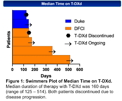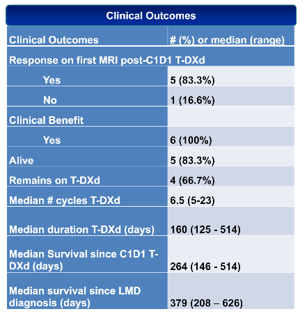 6例患者(100%)都获得了临床获益, 5例(83.3%)患者获得了MRI客观反应。患者的平均治疗周期为6.5(5-23)个周期。T-DXd治疗的中位持续时间为160天(125-514),6个患者中有4个患者(66.7%)接受了持续治疗。从开始接受T-Dxd治疗到死亡或最后一次随访的中位生存期为264天(146-514)。从最初诊断为软脑膜转移到死亡或最后一次随访的中位生存期为379天(208-626)。该研究也为T-Dxd在乳腺癌软脑膜转移患者以及其他HER2+肿瘤类型中进行前瞻性评估提供了理论依据。