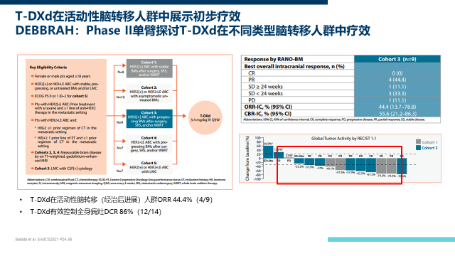 在II期单臂的DEBBRAH研究中纳入了活动性脑转移(经治后进展)的患者,结果显示在这部分人群中的ORR为 44.4%(4/9),T-DXd有效控制全身病灶DCR 为86%(12/14)。