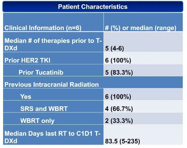 患者的临床特征见下表。在T-Dxd之前患者既往接受了中位5线的治疗,所有患者既往接受过TKI治疗,5位患者既往接受过图卡替尼治疗,所有患者都接受了颅内放疗,最后一次放疗到开始T-Dxd治疗的中位时长为83.5天。