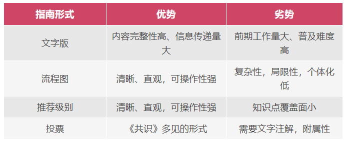 在指南的编写过程当中,专家组也在不断的思考如何对指南进行更好的呈现,因此,专家组对不同的指南呈现模式进行了比较: