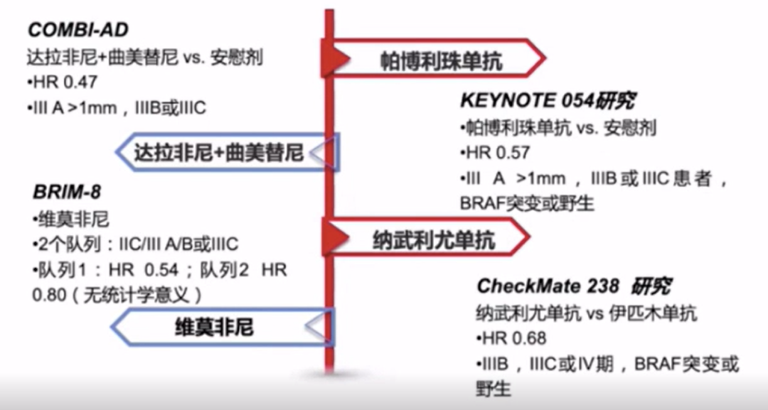 对于III期携带BRAF V600突变的患者,I级推荐达拉非尼+曲美替尼(1类),或观察,或参加临床试验;III期患者II级推荐帕博利珠单抗1年,或高剂量干扰素a-2b×1年;而IIIA、IIIB期携带BRAF V600突变的患者可II级推荐维莫非尼1年。