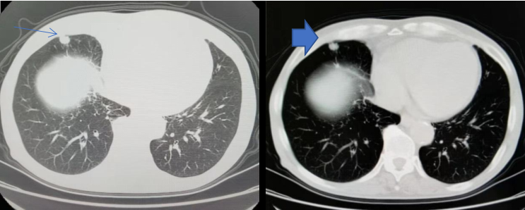 2021年1月3日胸部CT:右中肺结节增大,考虑转移。