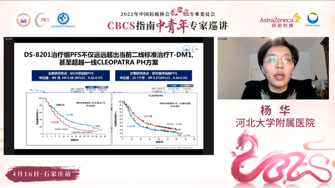 复旦大学附属肿瘤医院王碧芸教授主持下,河北大学附属医院杨华教授带来了《HER2阳性和HER2低表达晚期乳腺癌新型ADC临床研究》的精彩报告。杨华教授指出,当前抗HER2治疗的二线选择面临巨大瓶颈,初代ADC和小分子TKI的整体PFS不超过1年。中国参与的国际多中心DESTINY-Breast03研究已证实,DS-8201相较于既往二线标准T-DM1治疗,可显著降低72%的疾病进展风险(BICR评估的PFS:NR vs 6.8个月;HR 0.28;P<0.001),研究者评估的PFS达到25.1个月,从中能够看出DS-8201的巨大潜力,期待DESTINY-Breast05、DESTINY-Breast09等新辅助治疗、一线治疗的研究探索。在HER2低表达领域,A-J101研究显示DS-8201在中位治疗7.5线的情况下,仍可获得37%的ORR和11.1个月的PFS,国际Ⅲ期DESTINY-Breast04研究则已经报道达到PFS和OS双阳性结果,可以预见DS-8201未来将对乳腺癌的治疗格局带来更多的变革。