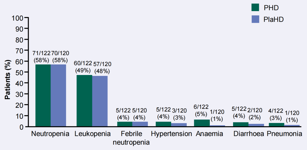 安全性方面,PHD组和安慰剂组≥3级AE发生率分别为74%和69%,严重AE发生率分别为25%和19%。PHD组常见的≥3级AE为中性粒细胞减少(58%)、白细胞减少(49%)、粒细胞减少性发热(4%)、高血压(4%)、贫血(5%)、腹泻(4%)、肺炎(3%)等。双靶组中有2例患者发生射血分数降低,但没有发生心衰、症状性左室收缩功能障碍或左室射血分数下降至<40%。