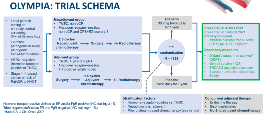 OlympiA研究是一项全球23个国家420家中心开展的随机、双盲、安慰剂对照Ⅲ期临床研究,在高风险临床病理因素、HER2阴性(HER2-)、BRCA1或BRCA2胚系突变或致病突变的早期乳腺癌辅助治疗中评估奥拉帕利对比安慰剂的有效性和安全性。研究共纳入1836例BRCA胚系突变或致病突变的HER2-早期高危乳腺癌患者,入组患者均接受局部治疗和(新)辅助化疗。对于接受新辅助治疗的患者,为未达病理学完全缓解(Non-pCR)的三阴性乳腺癌(TNBC)或者Non-pCR且CPS+EG评分>3分ER+/HER2-乳腺癌。对于接受辅助化疗的患者,为分期≥pT2或≥pN1的TNBC或者有≥4个阳性淋巴结的ER+/HER2-乳腺癌。患者按1∶1比例随机接受奥拉帕利300mg或安慰剂,每日两次,治疗一年。