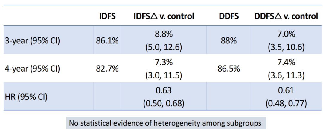 本次ESMO Virtual Plenary大会上报道的是发生330起iDFS事件(数据截止2021年7月12日,中位随访3.5年)的更新结果:3年iDFS分别为86.1%vs 77.3%,绝对获益为8.8%(95%CI:5.0%~12.6%),4年iDFS分别为82.7%vs 75.4%,绝对获益为7.3%(95%CI:3.0%~11.5%)。3年DDFS分别为88%vs 81%,绝对获益为7.0%(95%CI:3.5%~10.6%),4年DDFS分别为86.5%vs 79.1%,绝对获益为7.4%(95%CI:3.6%~11.3%)。3年OS率分别为92.8%vs 89.1%,绝对获益提高3.7%(HR=0.68,98.5%CI:0.47~0.97;P=0.009),4年OS率分别为89.2%vs 86.4%,绝对获益提高3.4%(95%CI:-0.1%~6.8%),跨越预设的显著性临界值(P<0.015)。