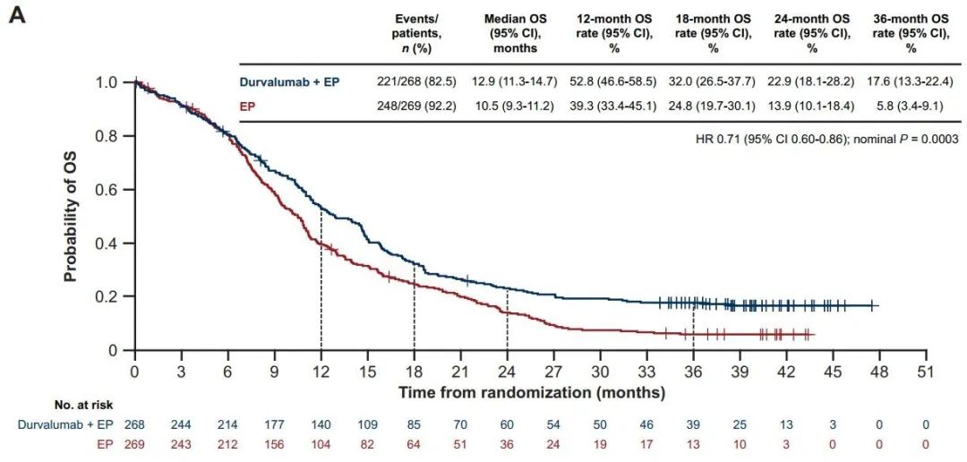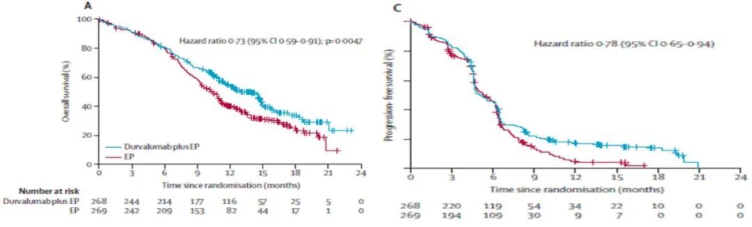 在进行第2次统计分析时,双免疫相较于单纯化疗,并未展现出更好的疗效。基于数据分析时候观察到的事件数,最终两组的OS比较时,显著性水准设定为0.0418,两组的OS分别为10.4个月和10.5个月,HR=0.82,P=0.045,小于预设的显著性水准,差异无统计学意义。但本次更新时,单免疫与化疗相比的数据变化不大,再次支持联合durvalumab的一线标准治疗地位。