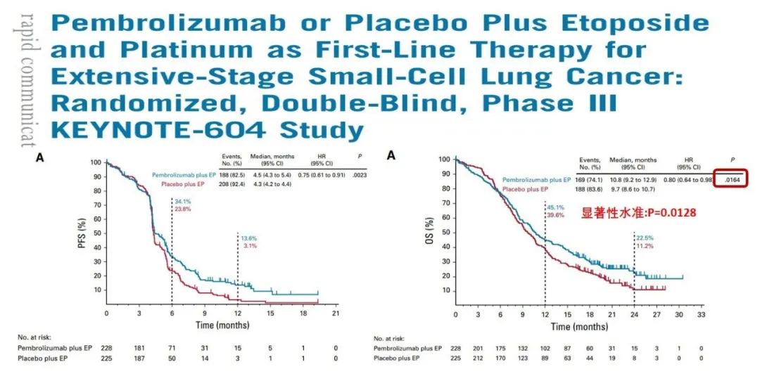●帕博利珠单抗[2]:由于KeyNote-604研究错失了OS这一关键终点,导致K药未能获得小细胞肺癌一线治疗适应症。该研究2020年在ASCO年会公布后,随后发表于JCO杂志。研究纳入453例患者,联合治疗组和单纯化疗组分别入组228例和225例患者。最终分析时,两组分别有82.5%和92.4%的患者出现疾病进展,联合治疗组和单纯化疗组的PFS分别为4.5个月和4.3个月,HR=0.75,差异有统计学意义(P=0.0023),12个月的PFS率分别为13.6%和3.1%。两组分别有74.1%和83.6%的患者出现死亡事件,两组的OS分别为10.8个月和9.7个月,差异无统计学意义(P=0.0164,低于预设的0.0124的阈值)。两组12个月的OS率分别为45.1%和39.6%,24个月的OS率分别为22.5%和11.2%。需要特别强调的是,该研究的阴性结果很大程度上是因为统计策略的不恰当(设置2次中期分析,且中期分析未按照预设的计划进行,导致α被过分消耗),而将一个本来可能是统计学上的阳性结果做成阴性结果。