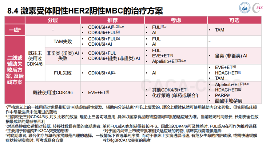 内分泌耐药是HR+/HER2-晚期乳腺癌面临的最大挑战之一,常见突变原理包括ER信号途径改变(ESR1突变和ER甲基化)、PI3K/AKT/mTOR通路激活以及表观遗传学修饰等。根据这些耐药机制,一些新型靶向药陆续研发成功,如CDK4/6抑制剂、PI3K抑制剂、AKT抑制剂、mTOR抑制剂等。随着这些抑制剂的研发与问世,晚期乳腺癌治疗已经进入抑制剂联合内分泌治疗的“内分泌+”时代,改变了HR+/HER2-晚期乳腺癌的治疗格局。我们根据2021版CACA-CBCS指南对HR+/HER2-MBC患者辅助治疗方案的推荐(表8.4),来看一下“内分泌+”时代,如何做治疗的“加法”。